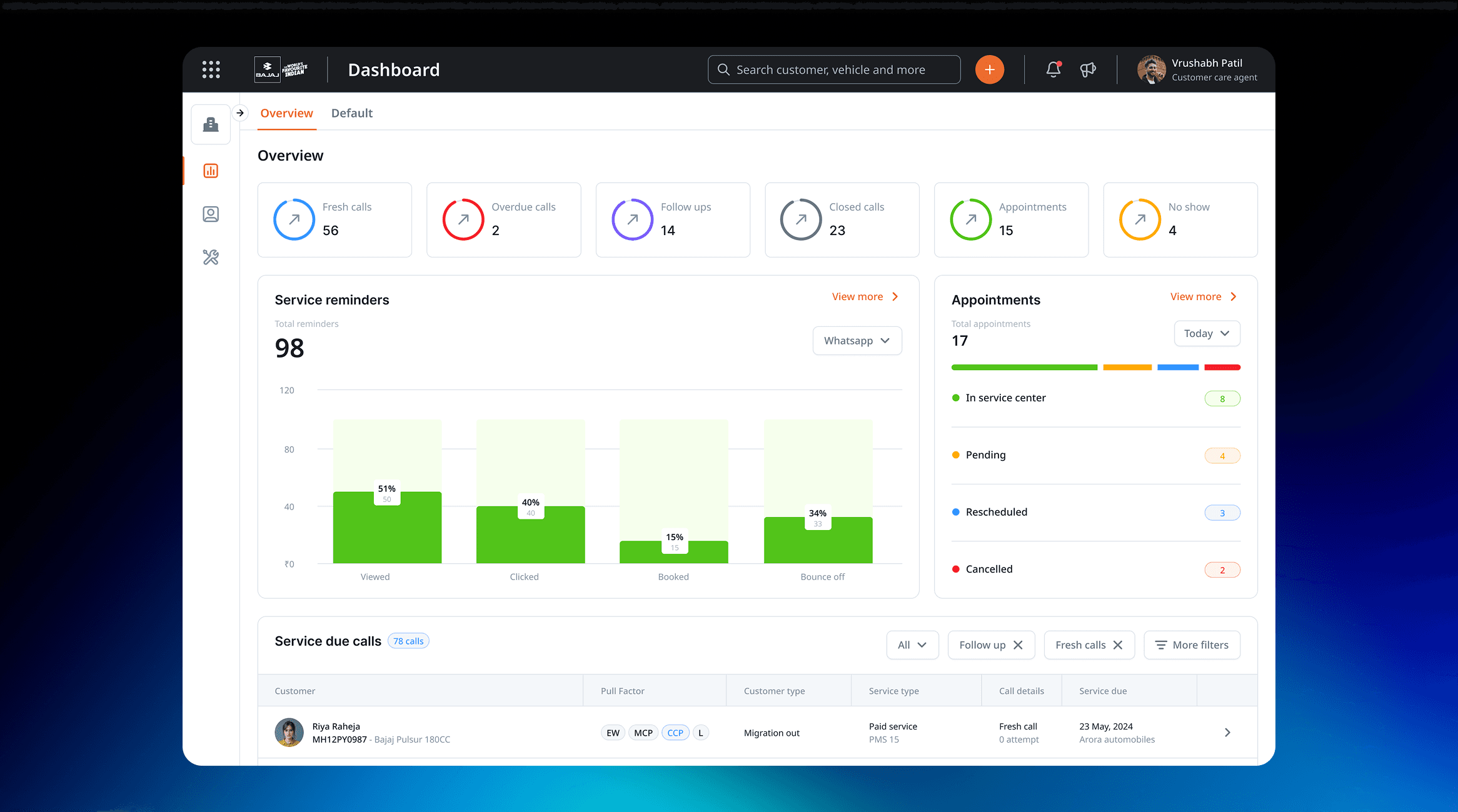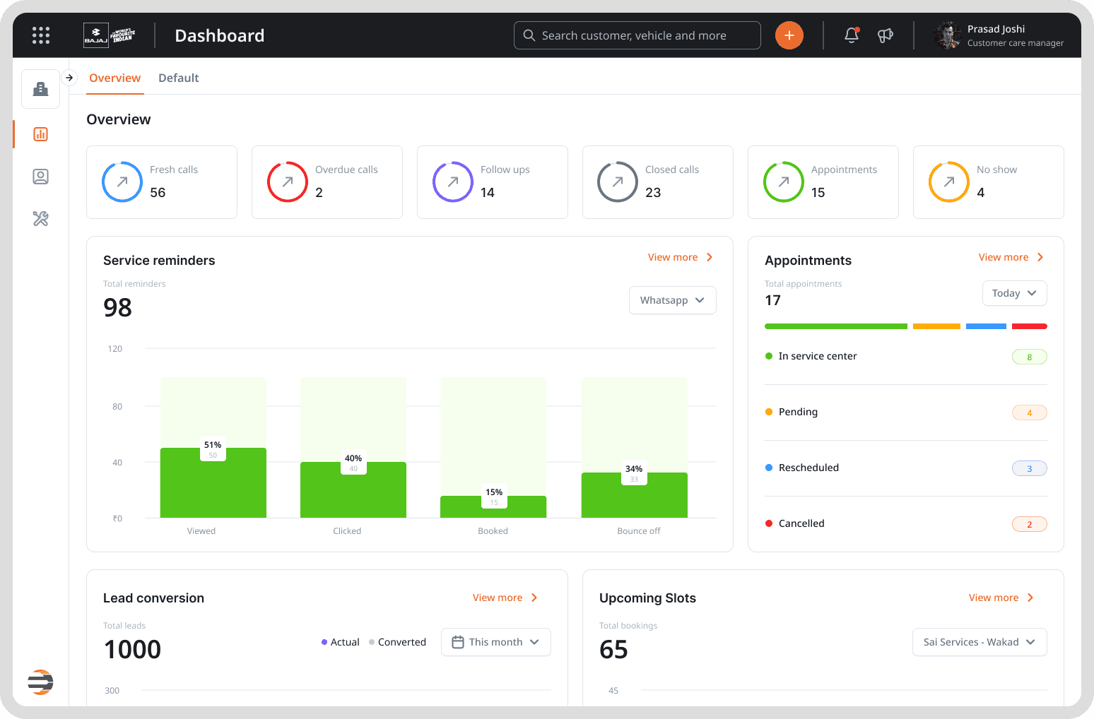 Overview of pending tasks, service KPIs, and customer feedback.